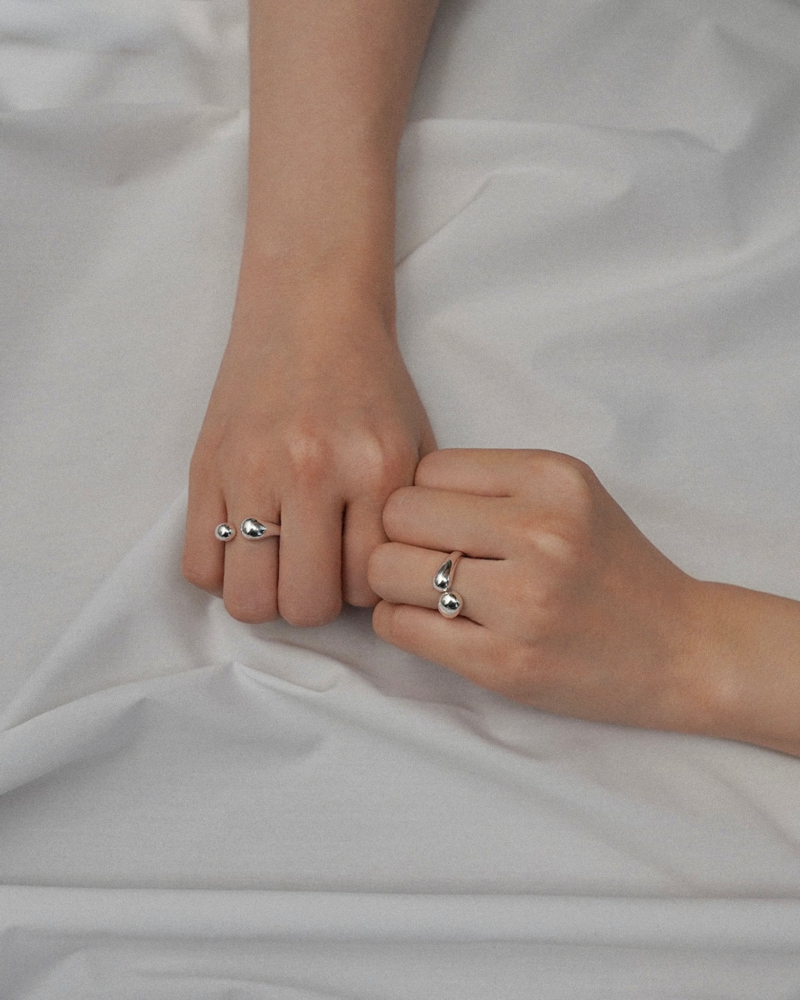 ふたつのしずくが、静かに引き合うように向かい合うDuo Drop Ring。